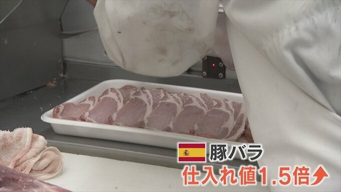中でも輸入した豚肉は著しく高騰し、スペイン産の豚バラ肉の仕入れ値は1㎏930円と1年前のおよそ1.5倍になっています。