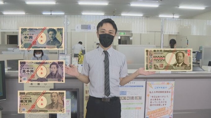 「さよなら野口、樋口、諭吉。そして、こんにちは栄一。新しい紙幣の取り扱いがきょうから県内でもスタートしました」