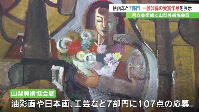 この展示会は山梨美術協会が毎年開いているもので、油彩画や日本画、工芸など7の部門で一般に募集した107点が展示されています。