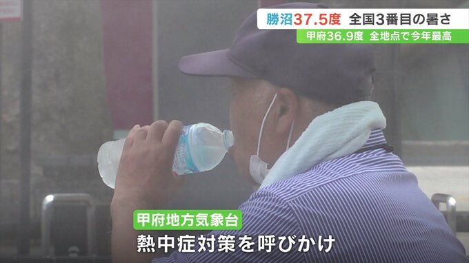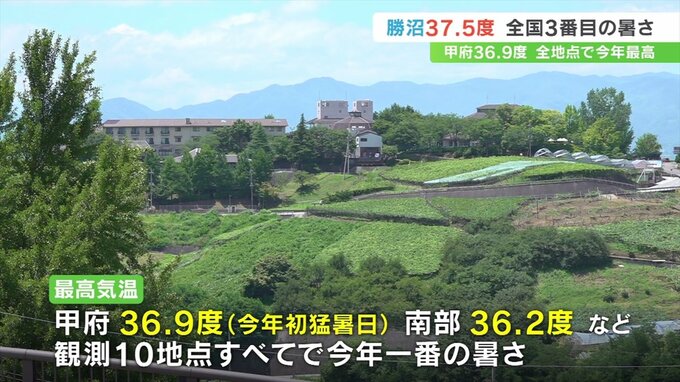 また甲府は36.9度と今年初めての猛暑日となったほか、南部で36.2度などと7地点で猛暑日となり、観測10地点すべてで今年1番の暑さとなりました。