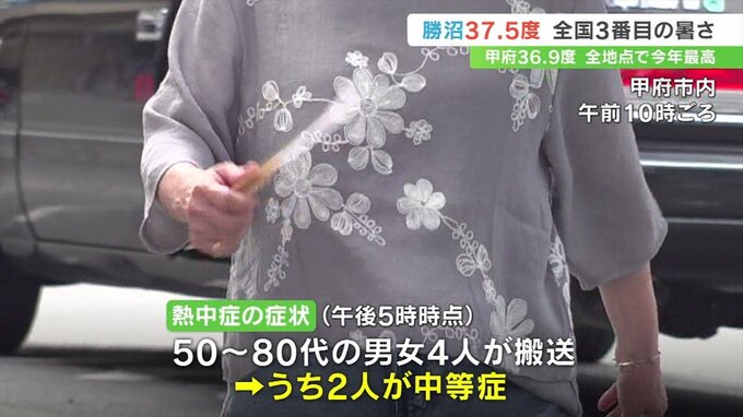 この暑さの影響で、笛吹市、韮崎市、甲斐市の50代から80代の男女4人が熱中症の症状で病院に運ばれ、このうち2人が入院が必要な中等症です。