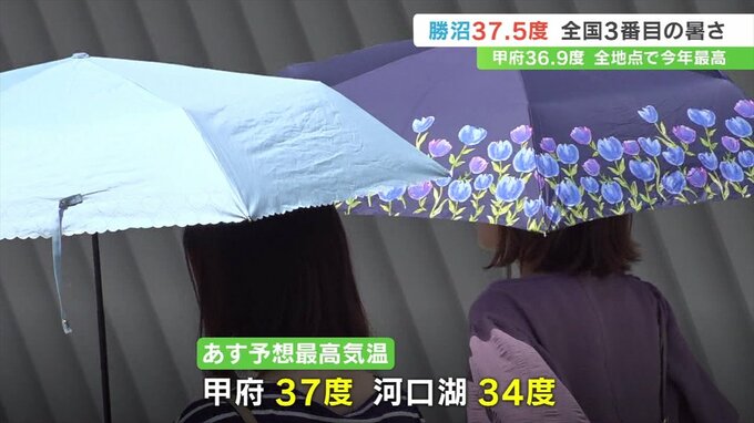 5日の予想最高気温は甲府で37度、河口湖で34度と4日と同じくらいの厳しい暑さが見込まれていて、気象台は熱中症対策を呼びかけています。