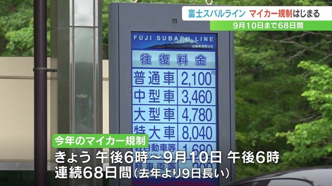 富士山の山梨県側の麓と5合目を結ぶ富士スバルラインのマイカー規制が5日午後6時から始まりました。