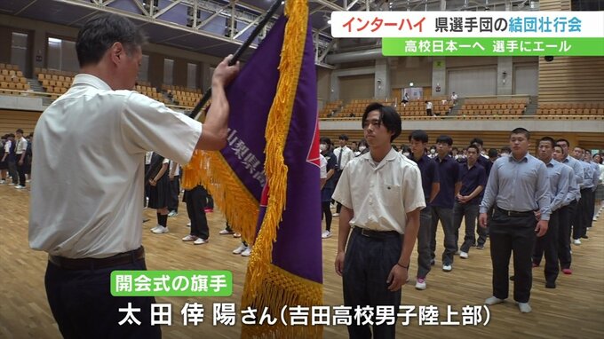 そして開会式で旗手を務める吉田高校 男子陸上部の太田倖陽さんに団旗が手渡され、駿台甲府高校 ハンドボール部の古澤宙大主将が意気込みを述べました。