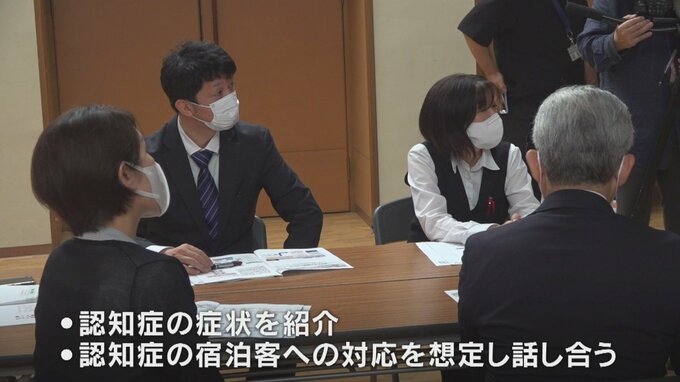 認知症の主な症状などが紹介された後、認知症の宿泊客が脱衣所で「服が見当たらない」と言っている状況への対応を参加者同士で話し合いました。