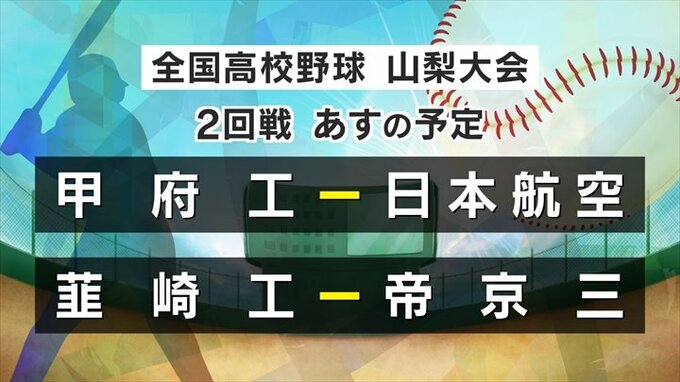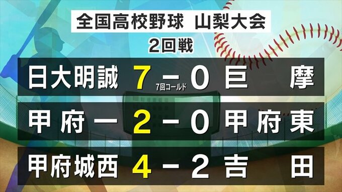 全国高校野球 山梨大会 2回戦の試合結果 2024年7月15日(月) 18:25 国内 全国高校野球山梨大会の結果です。 きょうは2回戦3試合が行われ、春の県大会で準優勝した日大明誠と甲府第一、甲府城西が勝ちベスト8に進出しました。 あすは甲府工業と日本航空、韮崎工業と帝京第三の2試合が予定され、ベスト8が出そろいます。