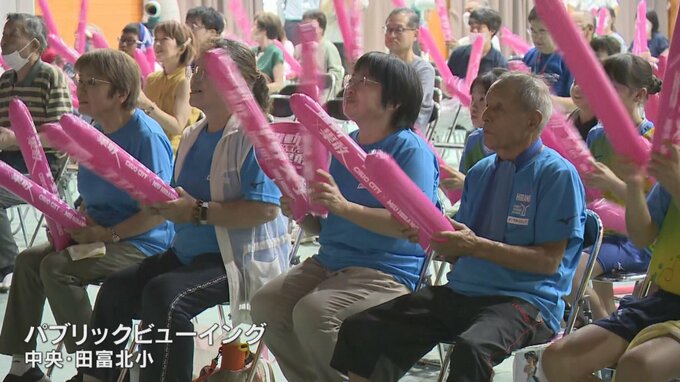 31日は母校の田富北小学校でパブリックビューイングが行われ、児童や同級生らおよそ100人がエールを送りました。