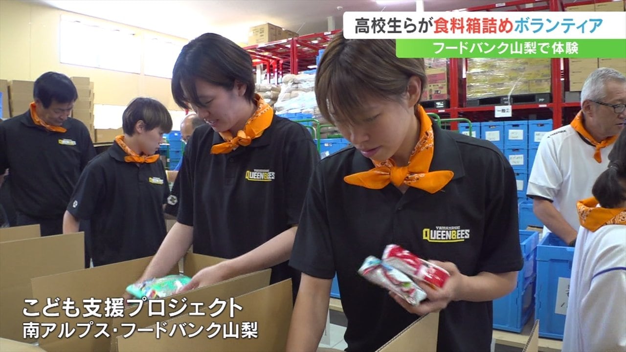 南アルプス市のフードバンク山梨で行われた支援活動には県内5つの高校の生徒42人と山梨クィーンビーズの選手らが参加しました。