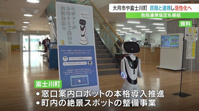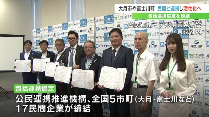 山梨県大月市や富士川町など全国5つの市と町が民間企業と連携して地域活性化に取り組む協定書を締結し、事業内容を発表しました。