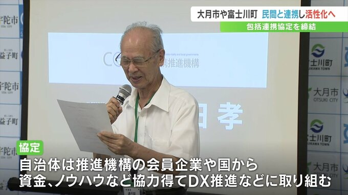 この協定は「公民連携推進機構」と大月市や富士川町を含む全国5つの市と町、それに17の民間企業が締結しました。
