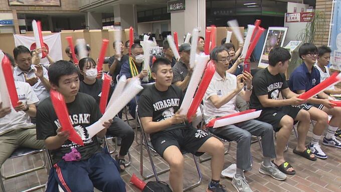韮崎市役所では文田の母校、韮崎工業高校の生徒らが声援を送りました。