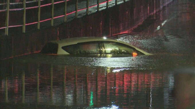 甲府市飯田にあるJR中央線のアンダーパスが冠水し2台の車が水没。