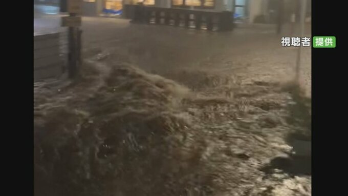 雷鳴が轟く中、凄まじい勢いで水が流れ込んでいるのは甲府市湯村の道路です。