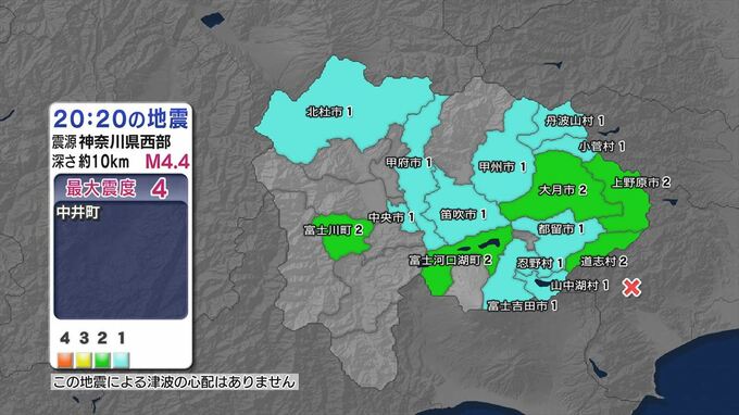 気象庁によりますと、震源地は神奈川県西部で、震源の深さはおよそ10km、地震の規模を示すマグニチュードは4.4と推定されます。