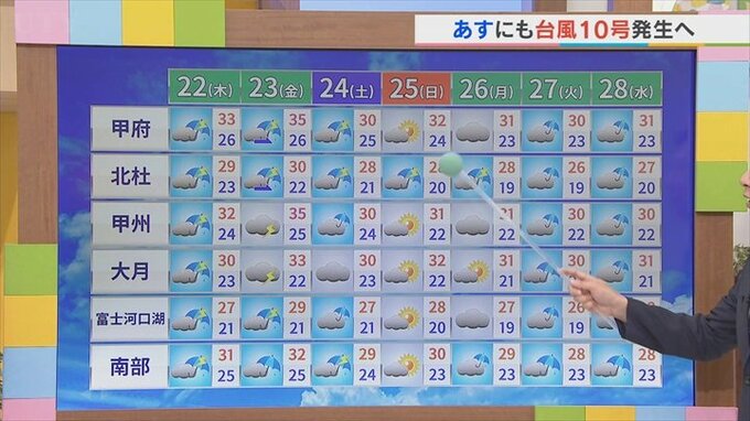 朝の最低気温は甲府は26℃の熱帯夜、南部も25℃を予想していますので夜間の熱中症対策もコップ一杯の水を飲むなど対策をお願いします。