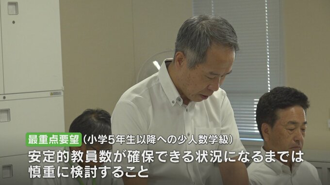連合会によりますと教員の多忙化解消や子どもの学習効果など少人数学級の推進には賛成であるものの、病気や産休の欠員をカバーする教員の確保などが難しくなっているということです。教員不足は全国的な問題で、県の少人数学級の拡大の実現に対する課題となっています。