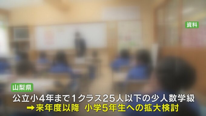 山梨県では現在公立の小学4年生まで1クラス25人以下の少人数学級を導入し、来年度以降、小学5年生への拡大を検討しています。
