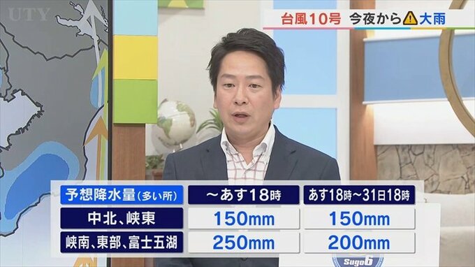 多いところ峡南、東部、富士五湖で250mm、これは南部で8月の1ヶ月に雨の降る量が平年で248mmなんです。つまり、たった1日間で1ヶ月分の雨が降る恐れがあります。そこからあす午後6時からあさって午後6時にかけてさらに雨の量が増えて、たった2日間でほぼ2ヶ月分の雨が降る恐れがあるということになります。