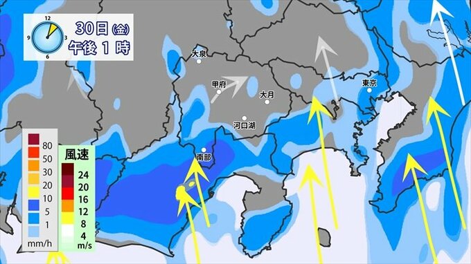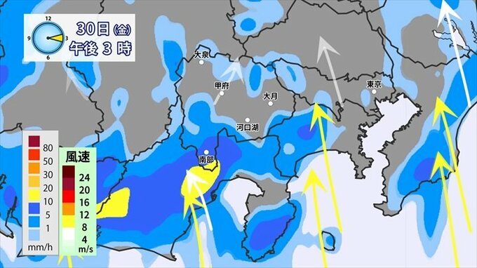 これは雨雲のもととなる暖かく湿った空気がもう入ってきてるんです。だんだん雨雲が南から北へと北上してきています。南からの風というのは、ダイレクトで富士川を通ってきますので、山に遮られず、山梨に入りやすいんです。