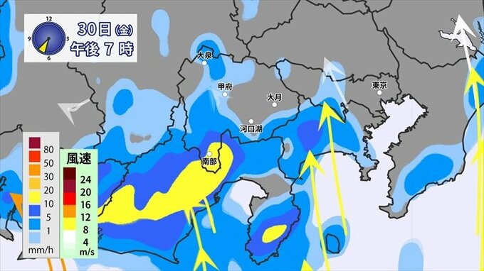 あすの朝にかけて県内では雨脚が強まり、激しい雨、滝のような雨が降る恐れがあります。一旦止み間もあるんですが、また午後になってくると、峡南方面は雨雲がぶつかりやすい場所となりますので、これによって同じようなところで雨が増える恐れがあります。