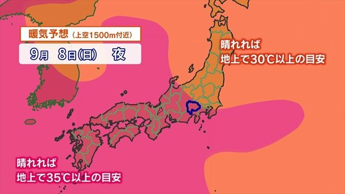 広くオレンジ色で塗られているところは晴れれば地上で30℃以上という目安、この日本の南にあるちょこっとピンク色のところは晴れれば地上で35℃以上という目安です。