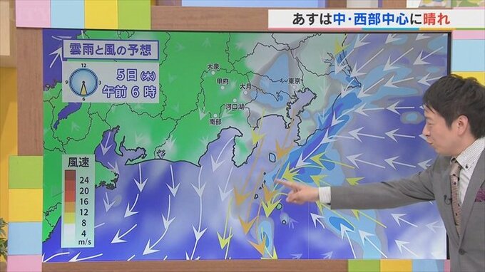 あすの午前6時から見ていきますと、この矢印の状態がまだ続きますし、この東寄りの風がずっと続くような状況となっているんです。