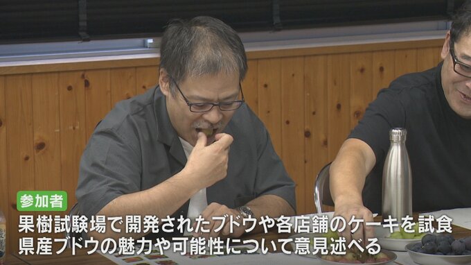続いて一行は果樹試験場で開発されたブドウやそれぞれの店舗から提供されたケーキなどを試食してスイーツの素材としての県産ブドウの魅力や可能性について意見を述べました。
