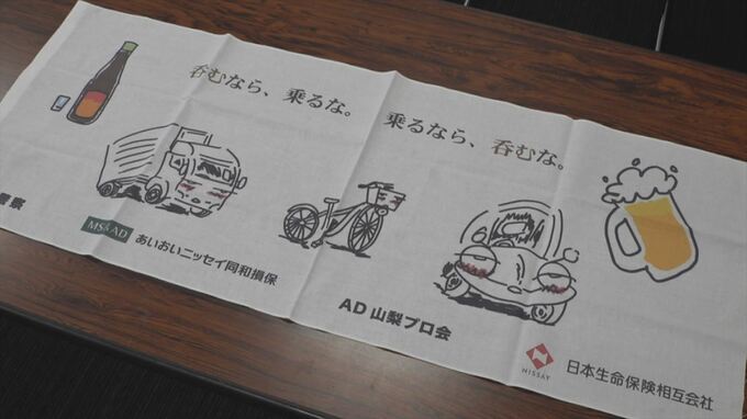 渡邉さんらは保険会社や県警と協力して「呑むなら、乗るな。乗るなら、呑むな。」などと書かれた手ぬぐいを作製し、保険会社の代理店や顧客に配布して飲酒運転根絶対策に貢献しました。
