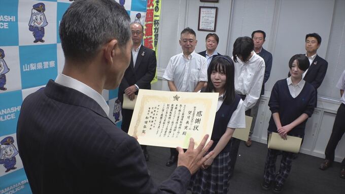 県警本部の和田弘記交通部長が感謝状を贈ったのは、あいおいニッセイ同和損害保険の山梨支店と駿台甲府高校美術デザイン科、それに生徒の渡邉航大さん、鈴木ひなさん、望月来実さんの3人です。