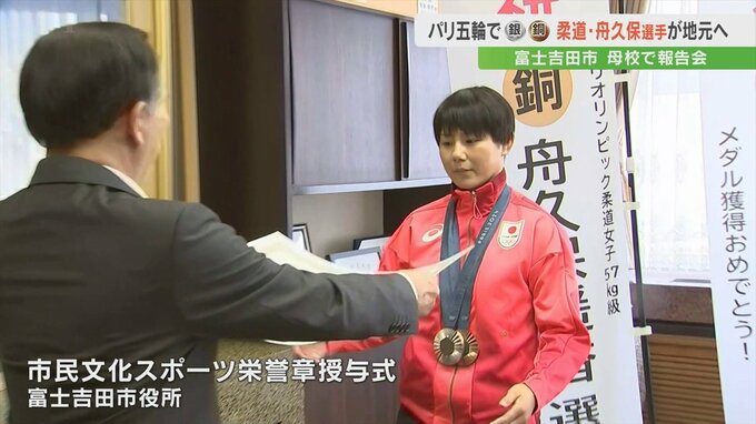 報告会に先立って舟久保選手は富士吉田市役所を訪れ、市から市民文化スポーツ栄誉章が贈られました。