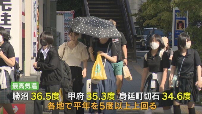 最高気温は勝沼で36.5度、甲府で35.3度などと各地で平年を5度以上上回り、勝沼は5日、甲府は2日続けて35度を超える猛暑日となりました。