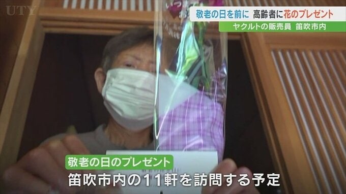 16日の「敬老の日」を前にヤクルトの販売員が高齢者の家を訪問し、花をプレゼントしました。