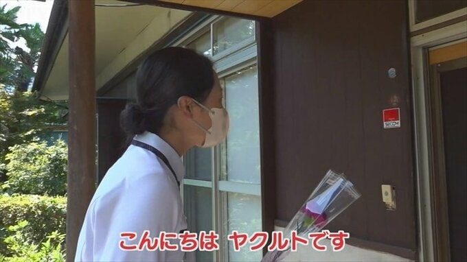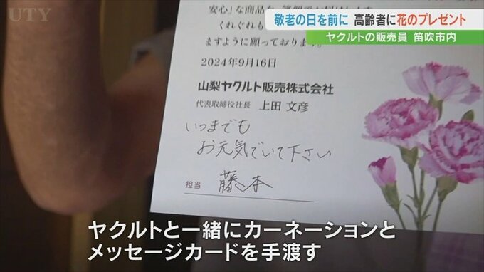 きょうは販売員が笛吹市の80代の女性が住む家を訪問しヤクルトと一緒に紫色のカーネーションと、「いつまでもお元気でいて下さい」と書かれたメッセージカードを手渡しました。