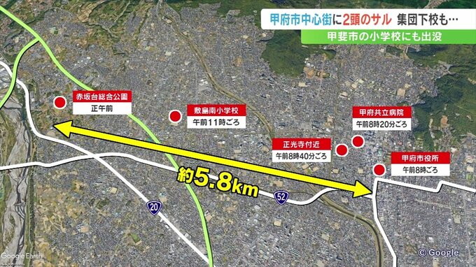 その後、サルは正午前にも甲斐市の赤坂台総合公園付近で目撃され甲府市役所から直線距離で約5.8kmに及びます。