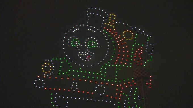 16日はLEDライトを搭載した500機のドローンが夜空に浮かび、人気アトラクション「FUJIYAMA」のロゴや、「きかんしゃトーマス」のキャラクターなどを映しだしました。