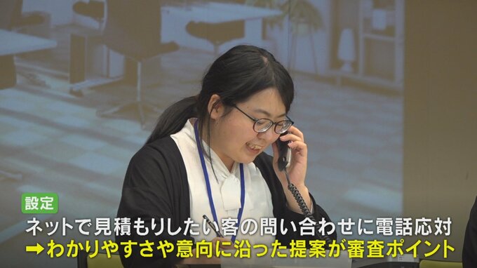 大会はインターネットで見積りをしたいという客の問い合わせに応対する設定で行われ、分かりやすく答えたかや、客の意向に沿う提案ができたかなどが審査のポイントになりました。
