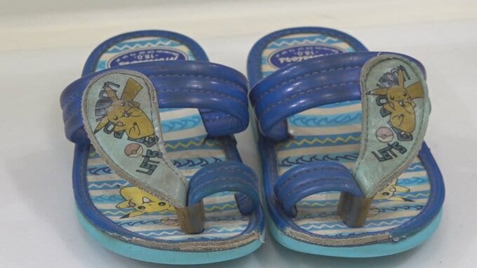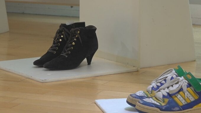 「こちらの展示会、人型のパネルの下には靴が置いてありますが、これらは実際に交通事故で亡くなった方々が履いていたものです」