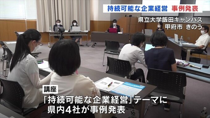 この講座は県立大学と県民生活センターが合同で開いたもので「持続可能な企業経営」をテーマに山梨に根差した4社が取り組み事例を発表しました。