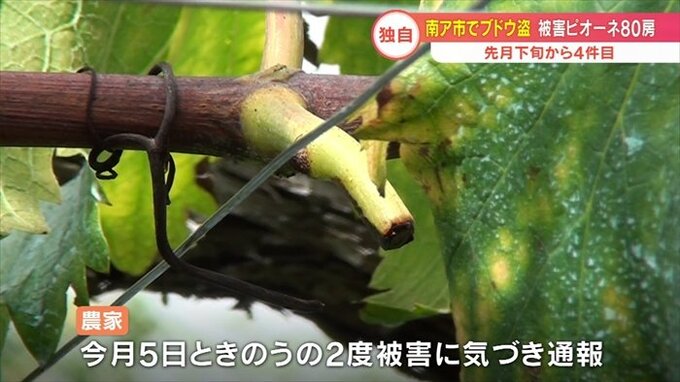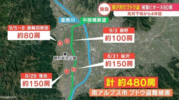 8月下旬からブドウの盗難が相次いでいる山梨県南アルプス市でまたもブドウが盗まれました。