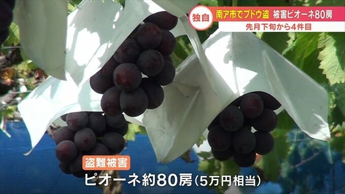 被害があったのは南アルプス市曲輪田新田のブドウ畑で、収穫間際のピオーネおよそ80房、5万円相当が何者かに盗まれました。