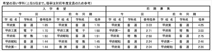 【調査一覧掲載】中学3年生の第一次進路希望調査 全日制公立高校は参考倍率1倍を下回る 山梨