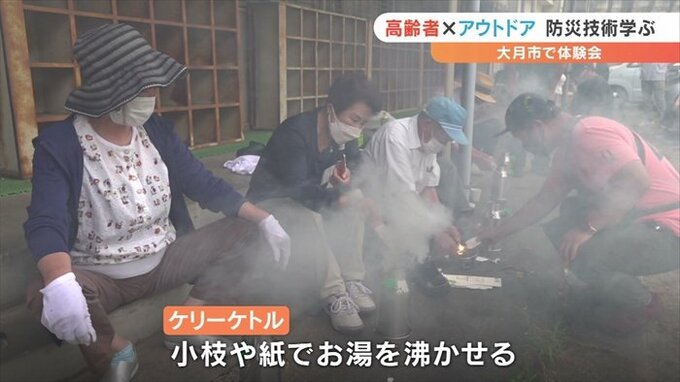 参加した高齢者は和やかな雰囲気で若者に人気のアウトドアの災害時の活用を学んでいました。