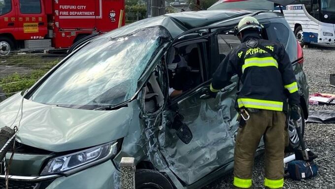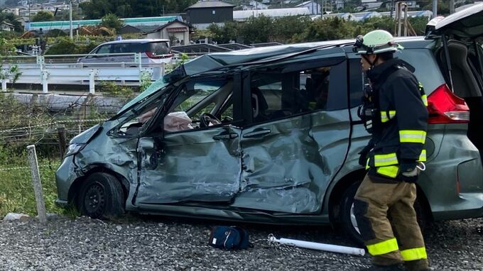 この事故で乗用車に乗っていた家族5人のうち、40歳の父親と34歳の母親が骨折など重傷、5歳と9歳の女の子2人が軽いけがをしました。