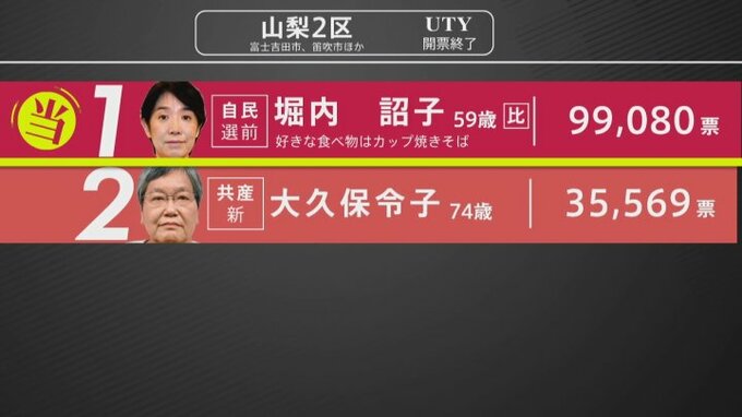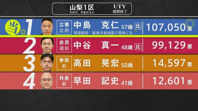 なお、山梨1区で敗れた自民党・前職 中谷真一氏は比例代表・南関東ブロックで復活当選が確実となっています。
