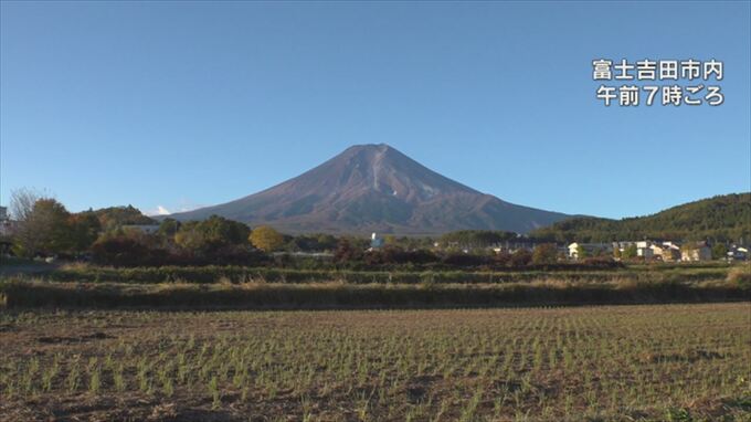 7日7時頃 富士吉田市内では、富士山の山頂より少し低いところから中腹付近にかけて、うっすらと雪が積もっているのが見えます。