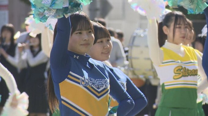 そして甲府駅周辺をディズニーやアニメの曲の演奏にのって県内19校、およそ430人が軽やかに行進しました。