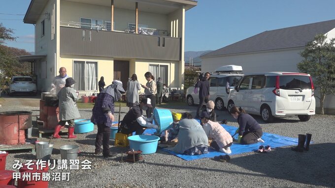山梨県甲州市勝沼町で地元の商工会の女性部が30年以上続けている味噌作りが行われました。