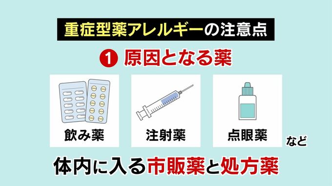 アレルギーの原因となる薬の種類は・飲み薬、注射薬、点眼薬など体内に入る薬で、市販薬と処方薬のいずれも発症の可能性があるということです。