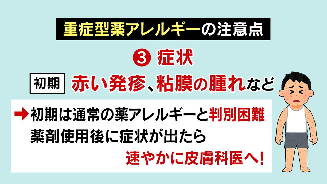 ただし、これは通常の薬アレルギーと見分けがつきにくいので、薬を使った後に発疹などの症状が出た場合は、速やかに皮膚科医に相談してほしいということです。