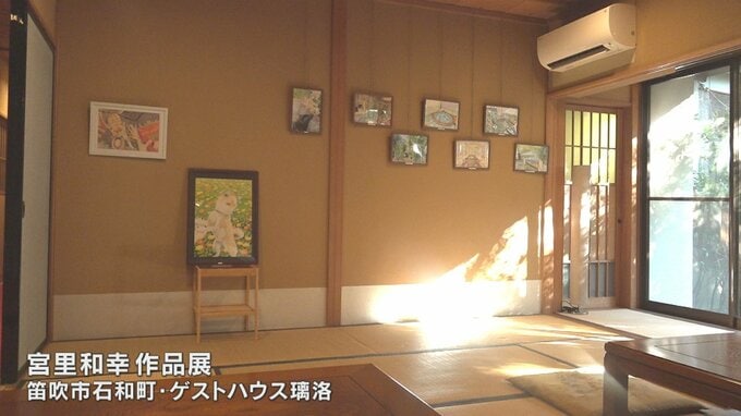 初開催となる作品展は宮里さんが働く笛吹市石和町のゲストハウス璃洛で2日始まり、館内には色鉛筆やクレヨンで描いた絵画およそ20点が並びます。